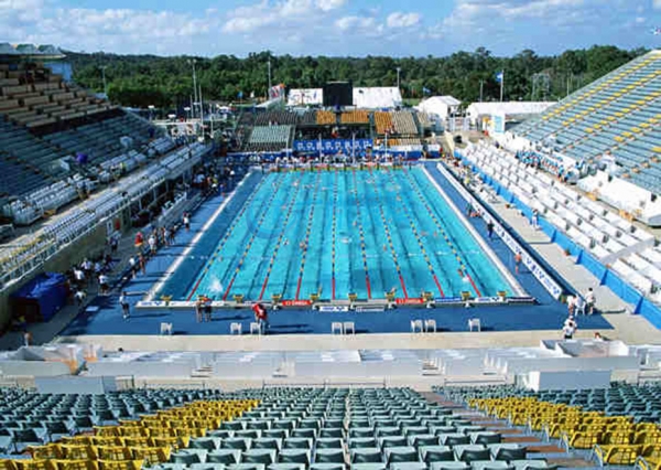 標(biāo)準(zhǔn)游泳池長50米,寬21米,奧運(yùn)會世界錦標(biāo)賽要求寬25米,另外還有長度只有一半即25米的游泳池稱為短池。水深大于1.8米。有8個泳道,每道寬2.5米,邊道另加0.5米,兩泳道間有分道線,分道線用浮標(biāo)線分掛在池壁兩端,池壁內(nèi)設(shè)掛線勾,池底和池端壁應(yīng)設(shè)泳道中心線,為深色標(biāo)志線。出發(fā)臺應(yīng)居中設(shè)在每泳道中心線上,臺面50厘米×50厘米。臺面臨水面前緣應(yīng)高出水面50至70厘米,臺面傾向水面不應(yīng)超過10度。游泳池的池岸寬一般出發(fā)臺端不小于5米,其余池岸不小于3米。正式比賽池,出發(fā)臺池岸寬不小于10米,其他岸寬不小于5米。