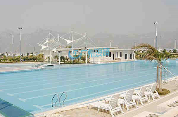 標(biāo)準(zhǔn)游泳池長50米,寬21米,奧運(yùn)會世界錦標(biāo)賽要求寬25米,另外還有長度只有一半即25米的游泳池稱為短池。水深大于1.8米。有8個(gè)泳道,每道寬2.5米,邊道另加0.5米。出發(fā)臺應(yīng)居中設(shè)在每泳道中心線上,臺面50厘米×50厘米。臺面臨水面前緣應(yīng)高出水面50至70厘米,臺面傾向水面不應(yīng)超過10度。游泳池的池岸寬一般出發(fā)臺端不小于5米,其余池岸不小于3米。正式比賽池,出發(fā)臺池岸寬不小于10米,其他岸寬不小于5米。國際也有25米游泳池的比賽。