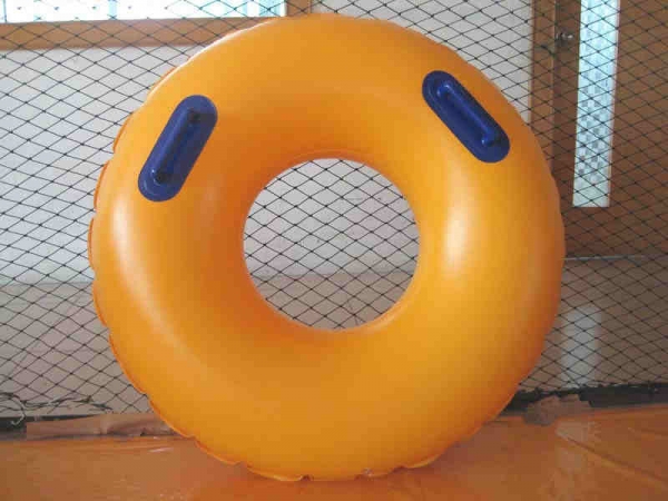 單人皮筏,皮筏本體采用PVC材料,高周波機壓熱合連接。要求連接部份去除多余材料,不得有漏氣現象。直徑1000mm