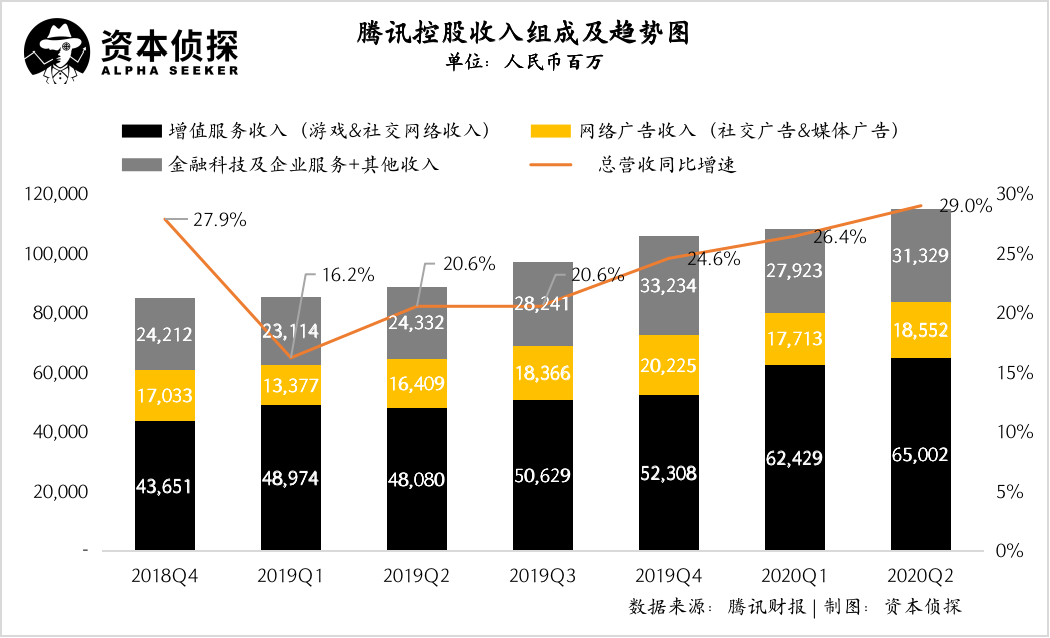 根據財報披露的數據,騰訊在2020年二季度營收為1148.83億元,同比增長29%,凈利潤為301.53億元,同比增長28%,雙雙超出市場預期。